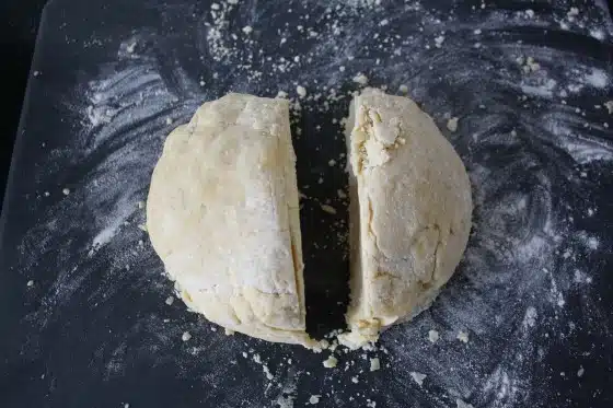 Gather the dough into a ball and divide into two pieces, one slightly larger than the other. The larger piece will be the bottom crust.