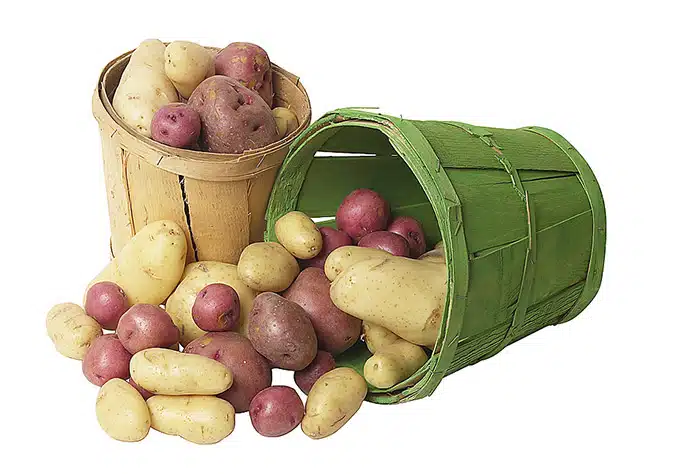 You can minimize the occurrence of sprouts and green patches if you store potatoes in a cool, dark, dry area in a mesh (not plastic) bag or basket for good airflow. The eyes are undeveloped buds. (In late spring, they can be cut out and planted for an early fall crop.) They are edible, but if sprouts develop from them, cut them out. The sprouts are usually bitter and often blacken when cooked; also, they contain solanine, a naturally occurring alkaloid that is toxic.