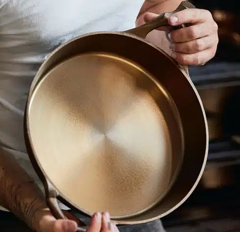 They finish with the hand, too. Although he uses an out-of-state foundry, the seasoning and the shipping happen here, with Cavallaro and his partner, Rue Sakayama, handling every piece of cookware, seasoning it with flaxseed oil in the unassuming-looking oven. Over time, and with use, the color will darken, deepening to the rich black of antique cast iron.