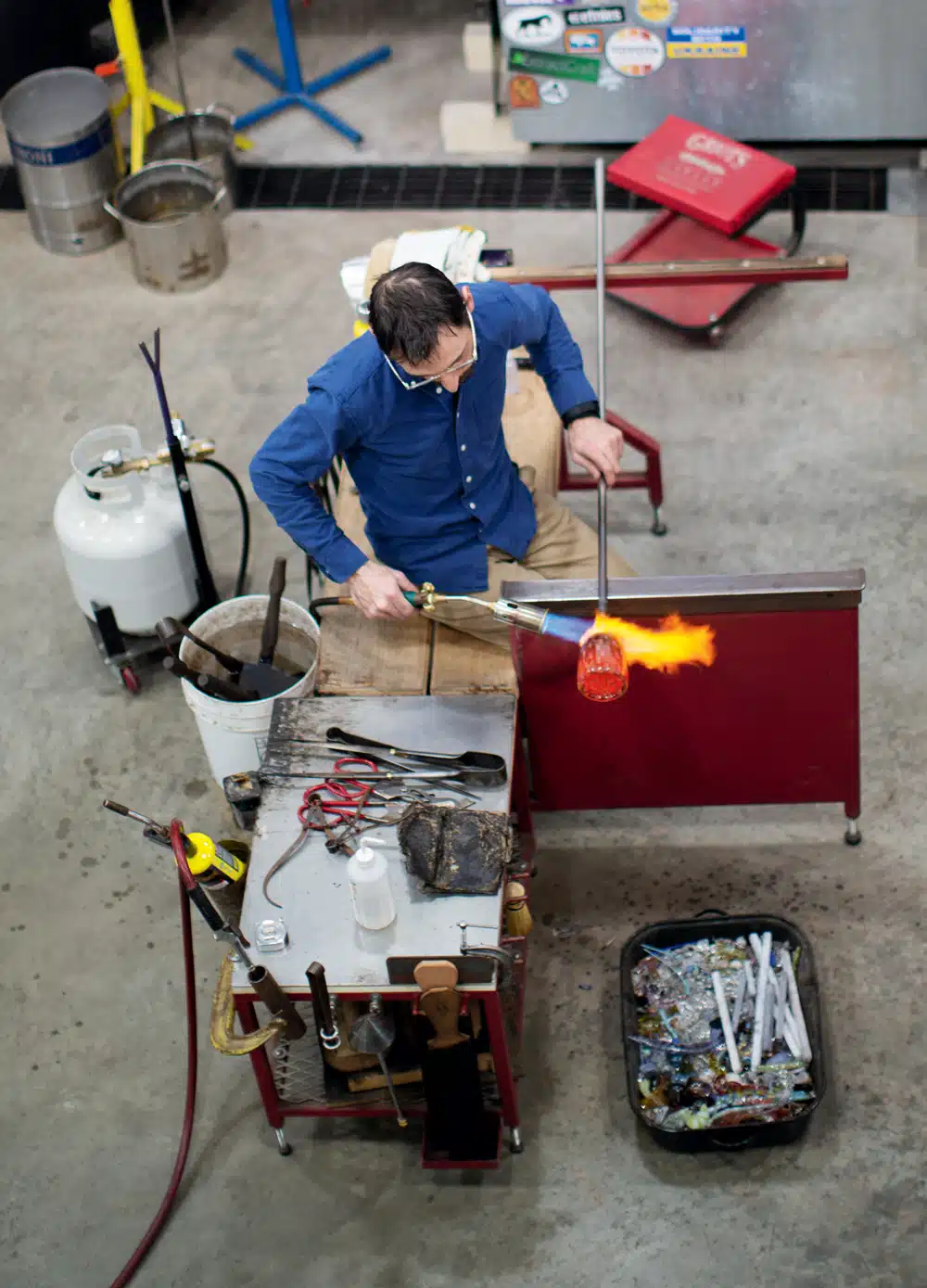 “We like to say that glass has a memory, and it remembers everything you do to it,” he explains. “A mistake is hard to overcome without starting over from scratch.” And, more obviously, the material is also fragile. “We’re utilizing the laws of gravity while making blown glass, but we’re also fighting against it.” Quite simply, “If a piece falls off a rod, it breaks.”