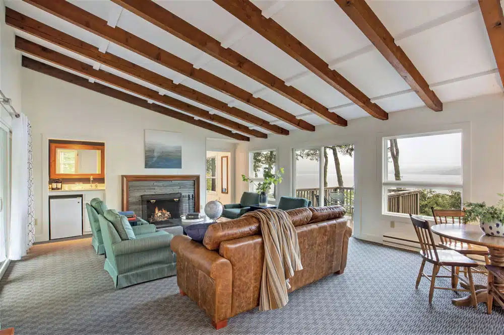 In her hands, discarded lumber becomes a headboard that anchors a bedroom setting. Salvaged barn wood is remade into sliding doors; an old dresser becomes a bathroom vanity. Textiles and blankets and quilts become wall hangings that catch the eye. For one vacation rental on a Vermont lake, she bought a stock image of a birch forest and had it blown up at the local photo shop. Backed with adhesive paper and placed on a bedroom wall, it changed the feel of the room dramatically—and for just a few hundred dollars.