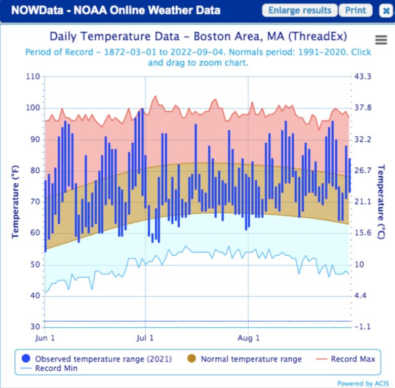 Daily temperatures in Boston during the summer of 2021. August had some hot days, but no cool nights!